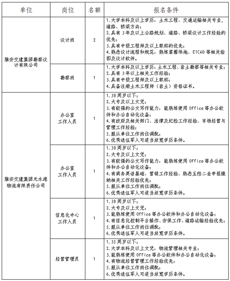 雅安交建集團(tuán)關(guān)于公開招聘所屬子公司工作人員的公告(無水港公司、勘察設(shè)計(jì)公司)