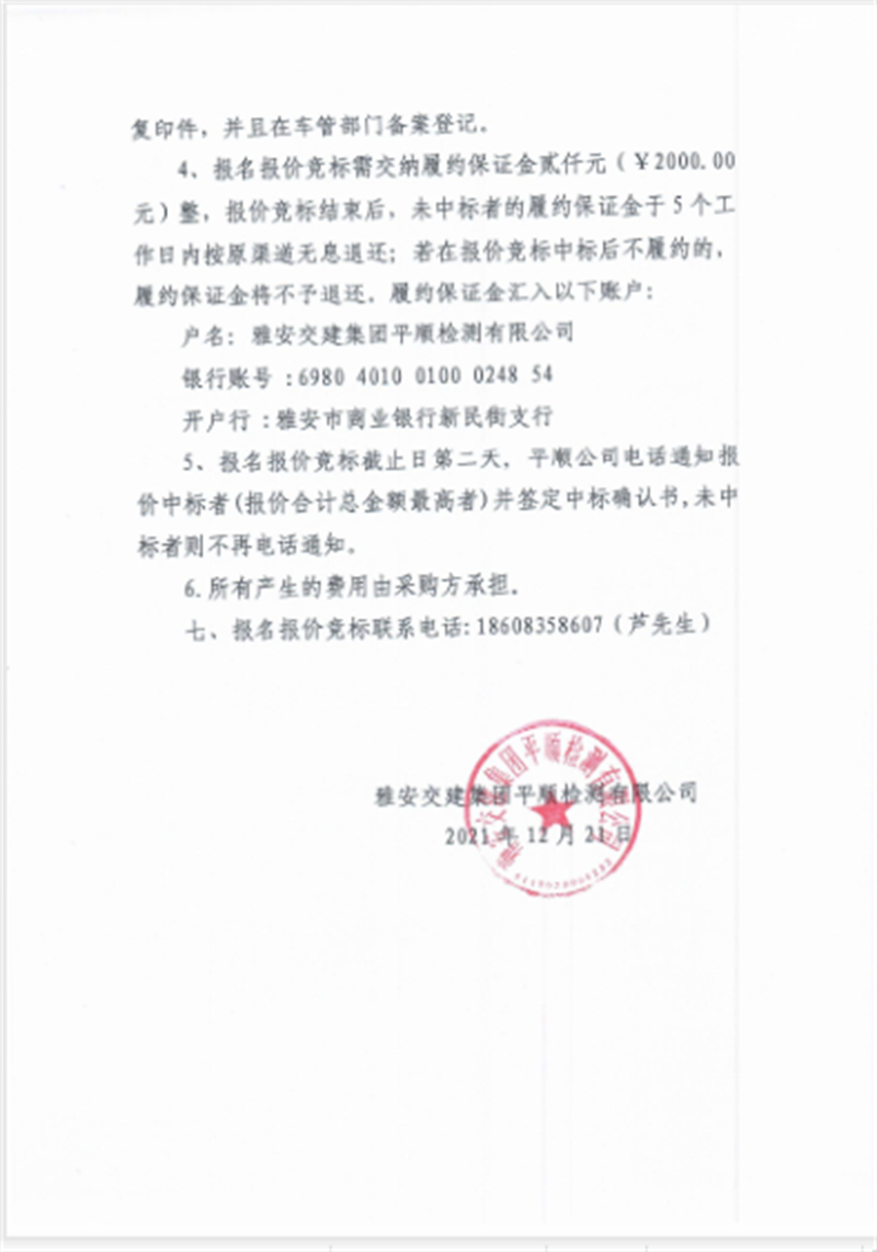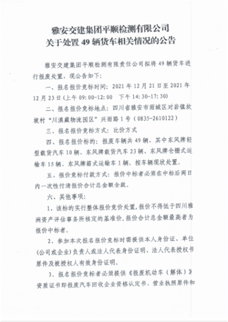 雅安交建集團平順檢測有限公司 關(guān)于處置49輛貨車相關(guān)情況的公告