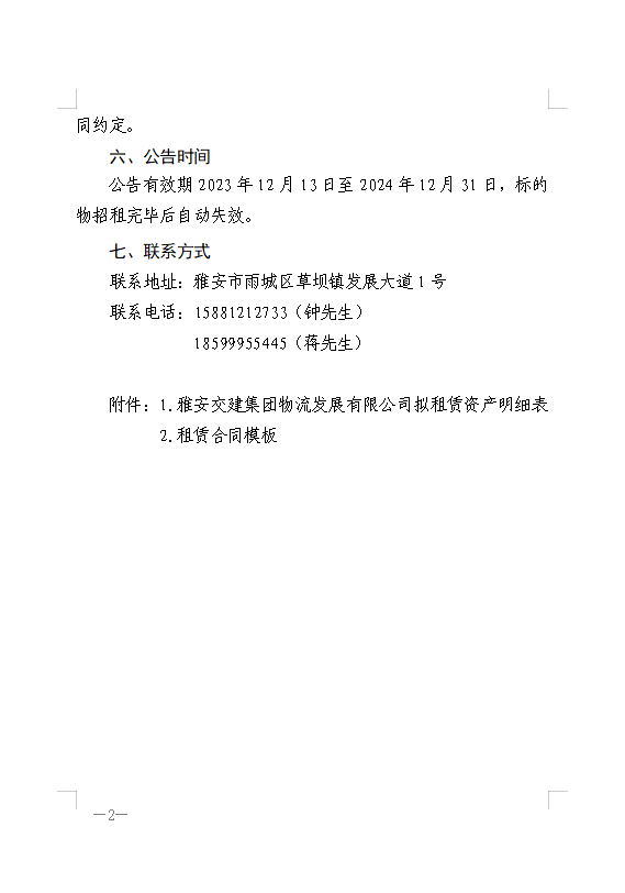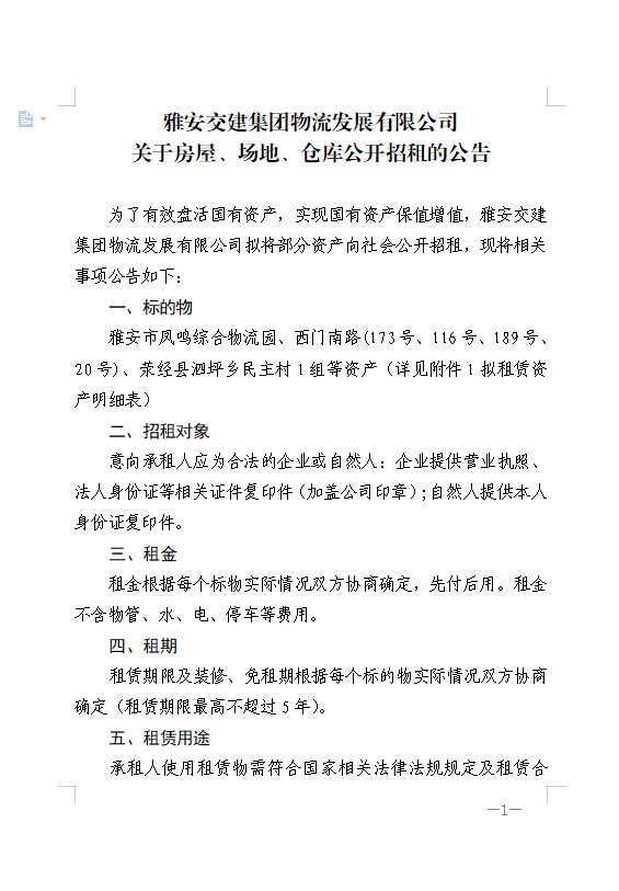 雅安交建集團(tuán)物流發(fā)展有限公司關(guān)于房屋、場(chǎng)地、倉庫公開招租的公告附件1、2