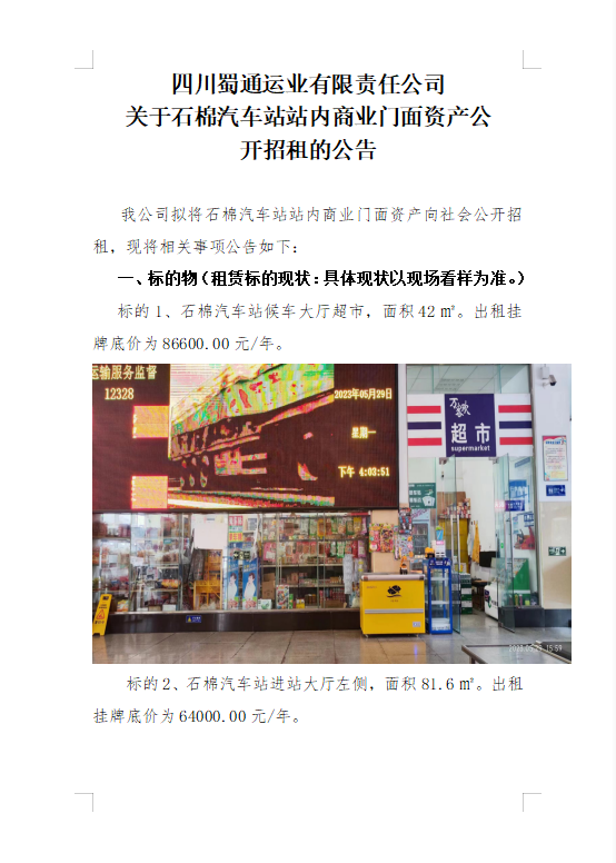 四川蜀通運(yùn)業(yè)有限責(zé)任公司關(guān)于石棉汽車站站內(nèi)商業(yè)門面資產(chǎn)公開(kāi)招租的公告