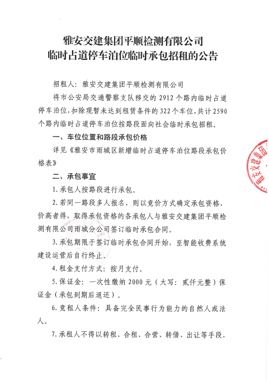 雅安交建集團平順檢測有限公司臨時占道停車泊位臨時承包招租的公告