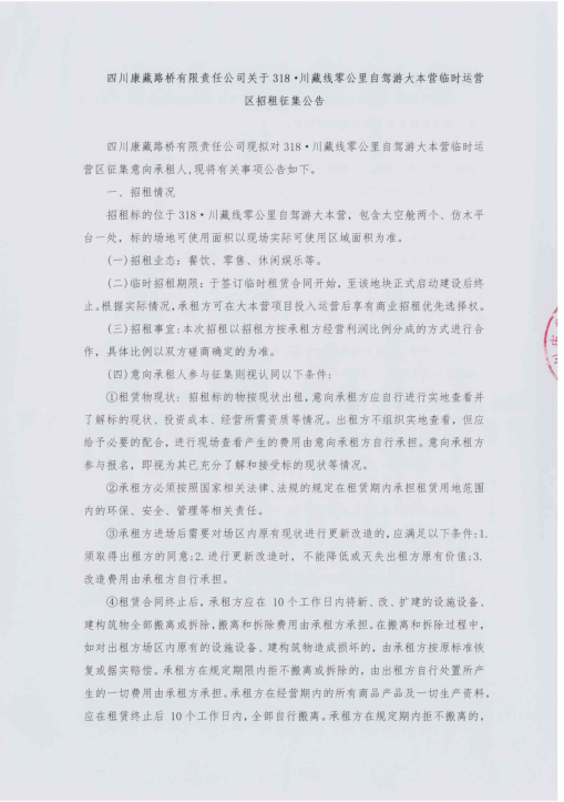 四川康藏路橋有限責(zé)任公司318·川藏線零公里自駕游大本營臨時用地臨時招租征集公告