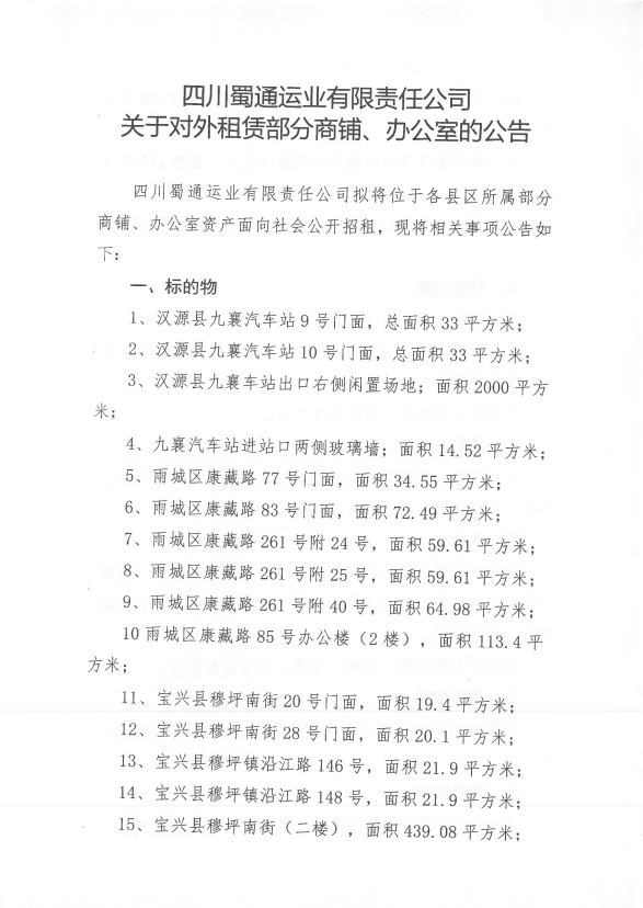 ËÄ´¨Êñͨß\˜I(y¨¨)ÓÐÏÞØŸ(z¨¦)Èι«Ë¾êP(gu¨¡n)ÓÚŒ¦Íâ×âÙU²¿·ÖéTÃæ¡¢Þk¹«ÊÒÙY®a(ch¨£n)µÄ¹«¸æ