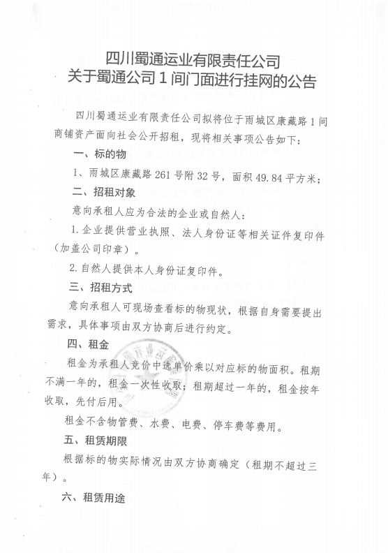 四川蜀通運(yùn)業(yè)有限責(zé)任公司關(guān)于蜀通公司1間門(mén)面進(jìn)行掛網(wǎng)的公告