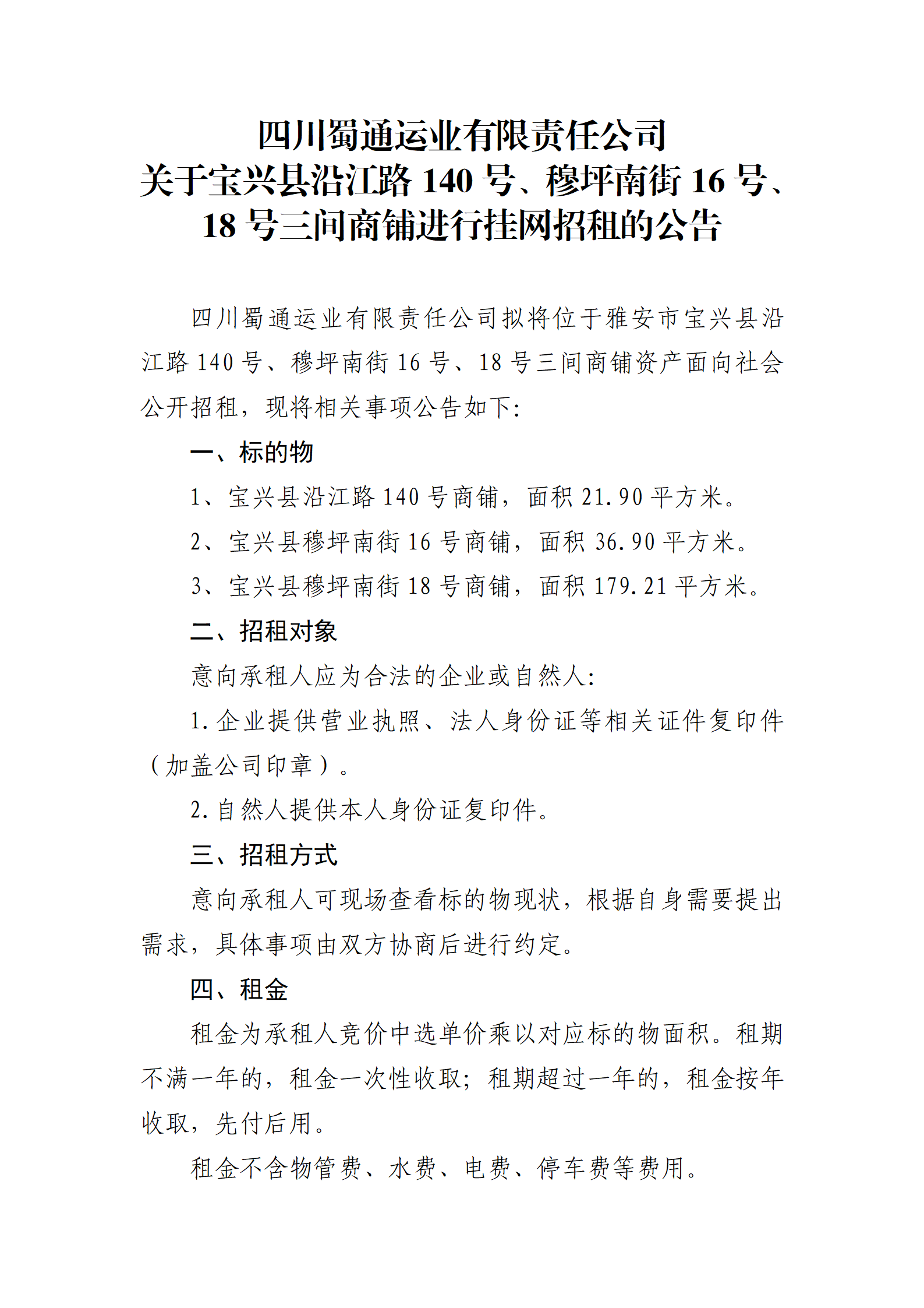 四川蜀通運(yùn)業(yè)有限責(zé)任公司 關(guān)于寶興縣沿江路140號(hào)、穆坪南街16號(hào)、18號(hào)三間商鋪進(jìn)行掛網(wǎng)招租的公告