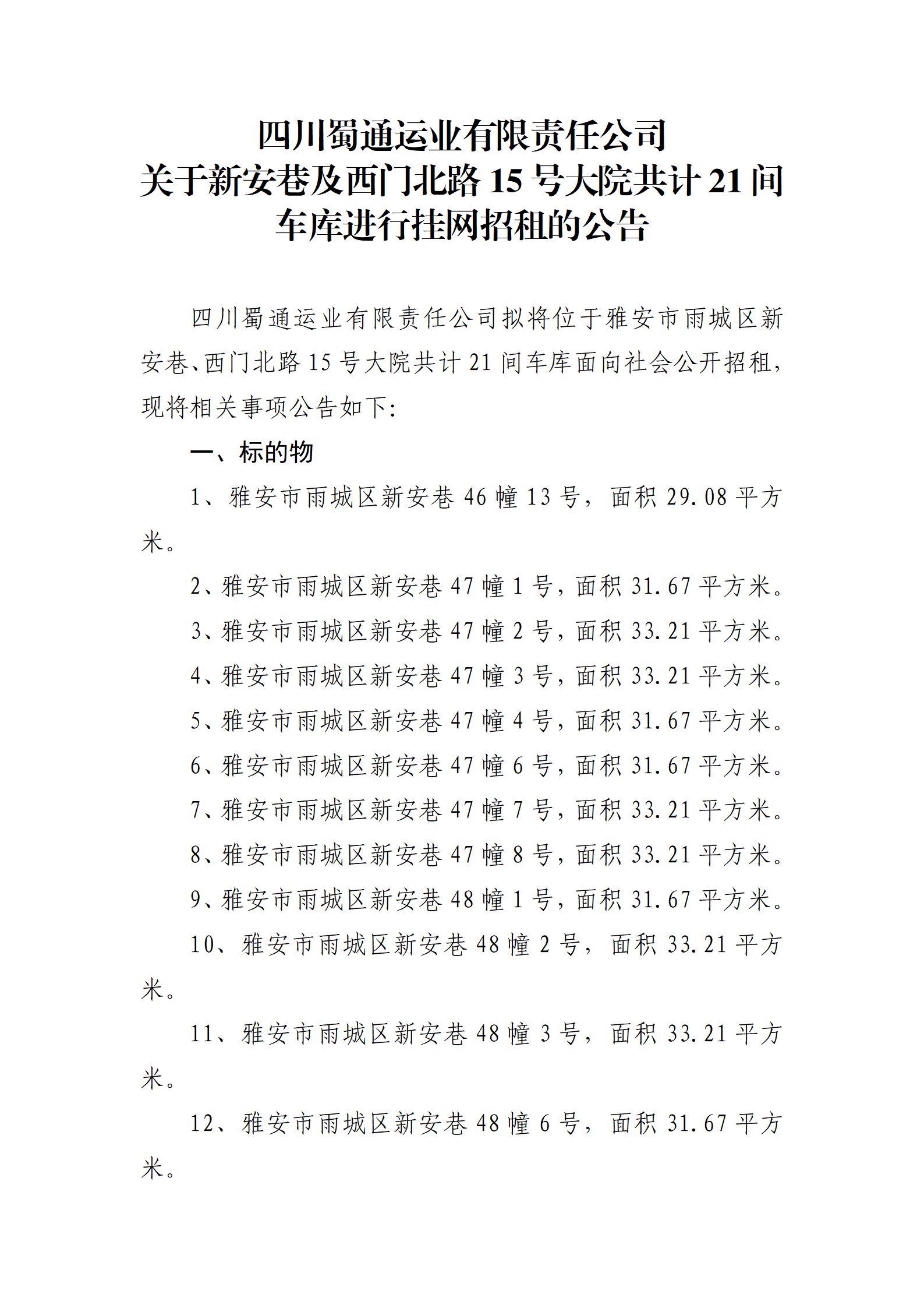 四川蜀通運(yùn)業(yè)有限責(zé)任公司 關(guān)于新安巷及西門北路15號(hào)大院共計(jì)21間車庫進(jìn)行掛網(wǎng)招租的公告