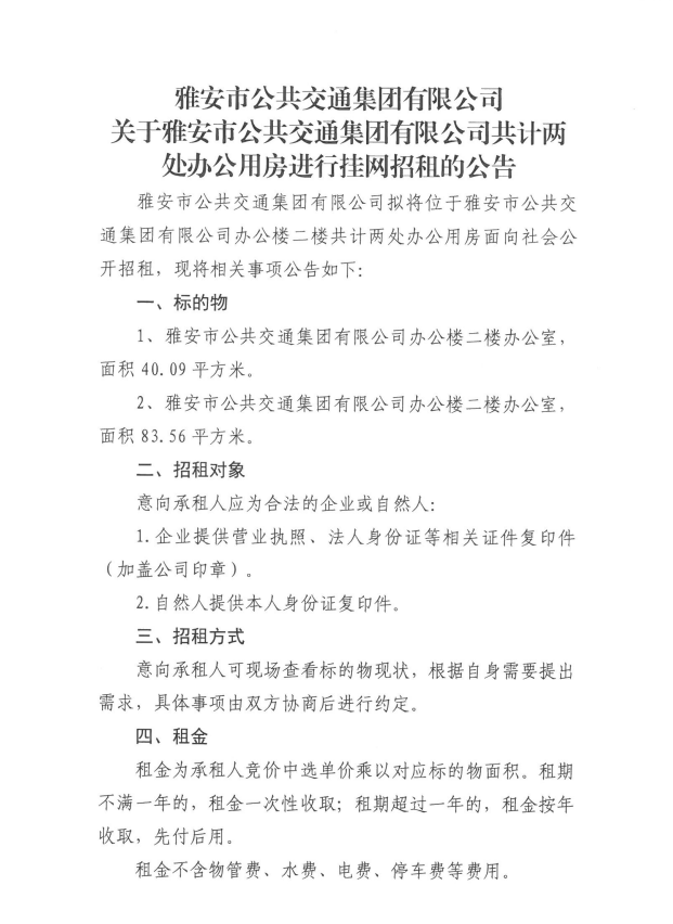 關于雅安市公共交通集團有限公司共計兩處辦公用房進行掛網(wǎng)招租的公告