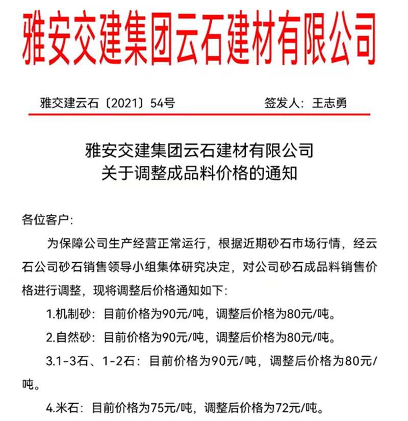 雅安交建集團(tuán)云石公司關(guān)于調(diào)整成品料銷售價(jià)格的通知(2021.11.4)