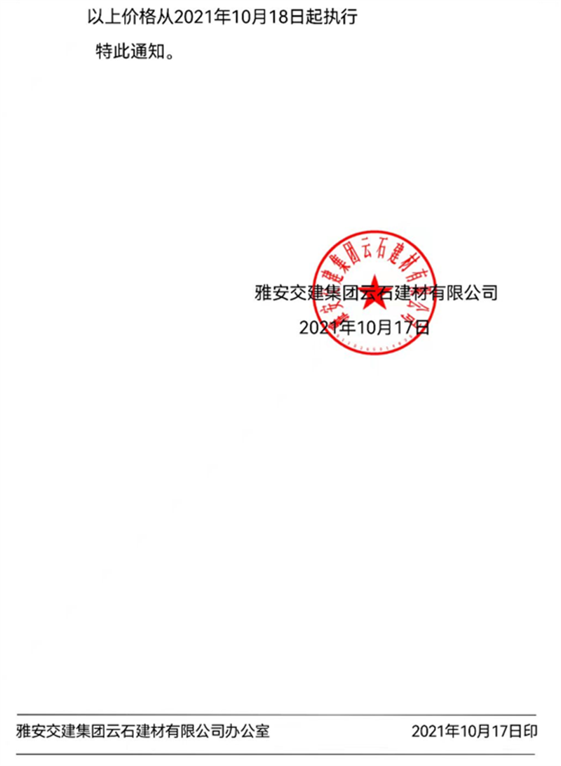 雅安交建集團(tuán)云石公司關(guān)于調(diào)整成品料銷售價(jià)格的通知(2021.10.17)