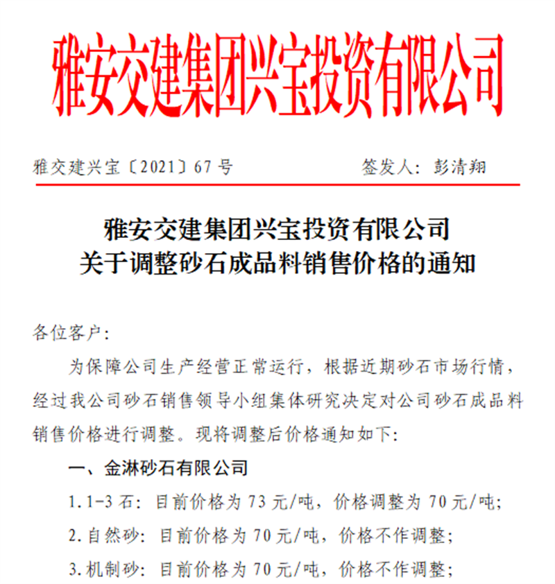 雅安交建集團(tuán)興寶公司關(guān)于調(diào)整成品料銷售價格的通知(2021.10.9)