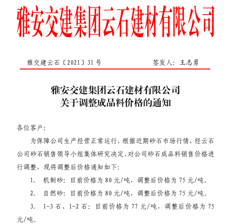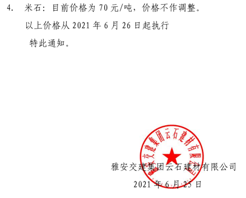 雅安交建集團云石公司砂石骨料銷售價格情況表(2021.7.12)