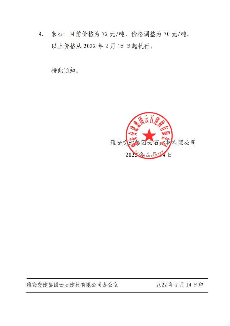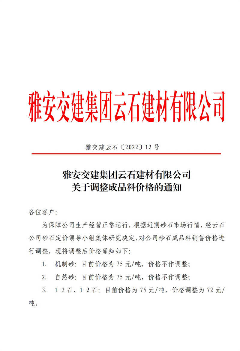 ÑŰ²½»½¨¼¯ˆF(tu¨¢n)ÅdŒšÍ¶ÙYÓÐÏÞ¹«Ë¾ êP(gu¨¡n)ÓÚÕ{(di¨¤o)Õûɰʯ³ÉÆ·ÁÏäN(xi¨¡o)ÊÛƒr(ji¨¤)¸ñµÄ֪ͨ£¨2022-2-23£©