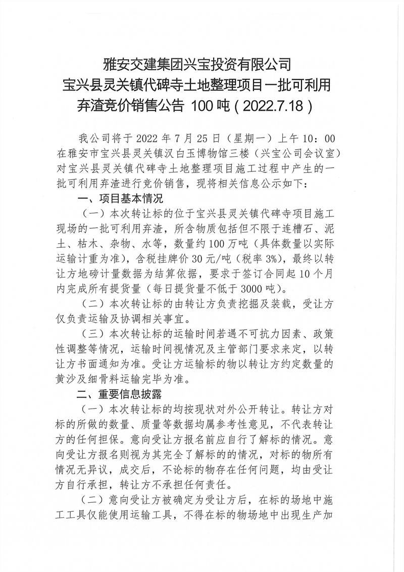 寶興縣靈關(guān)鎮(zhèn)代碑寺土地整理項(xiàng)目一批可利用棄渣競(jìng)價(jià)銷售公告7.18(100萬(wàn)噸)