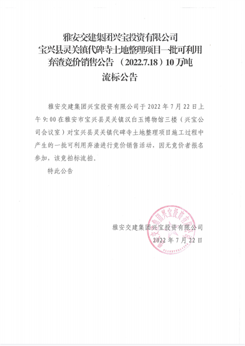興寶公司寶興縣靈關(guān)鎮(zhèn)代碑寺土地整理項目10萬噸可利用棄渣競價銷售掛網(wǎng)公告7.22(10萬噸)