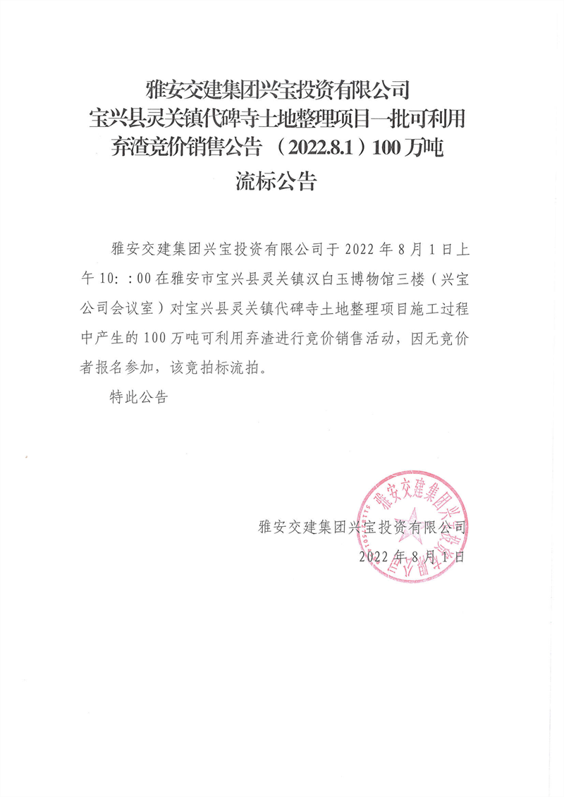 雅安交建集團(tuán)興寶投資有限公司靈關(guān)鎮(zhèn)代碑寺土地整理項(xiàng)目100萬(wàn)噸可利用棄渣競(jìng)價(jià)銷(xiāo)售流標(biāo)公告(2022.8.1)