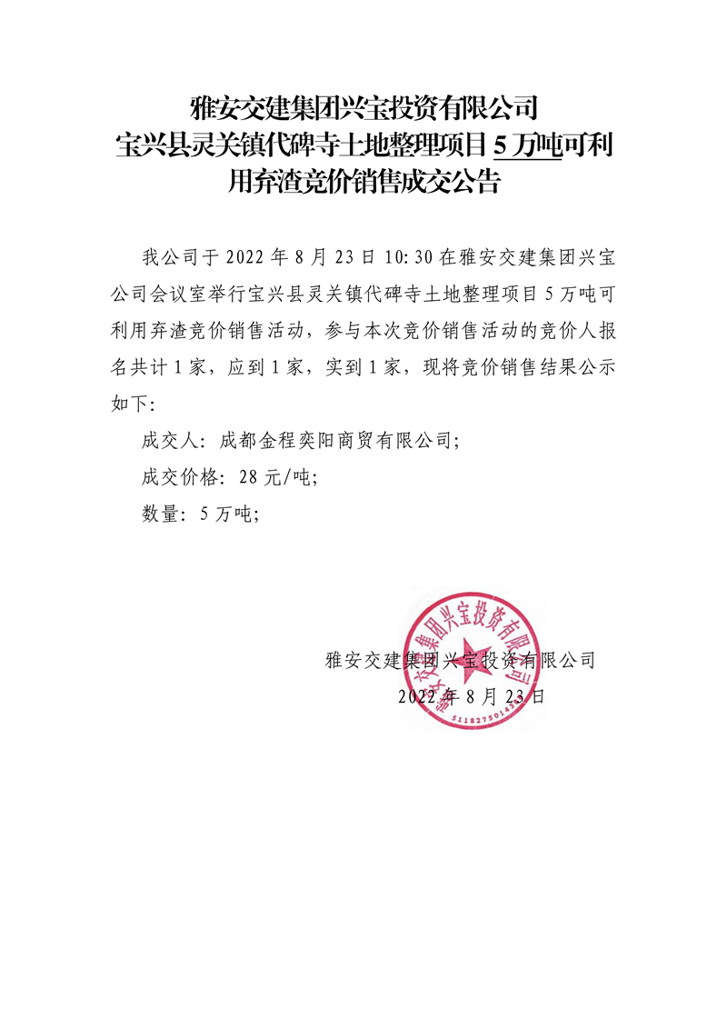 雅安交建集團興寶投資有限公司寶興縣靈關(guān)鎮(zhèn)代碑寺土地整理項目5萬噸可利用棄渣競價銷售成交公告(8.23)