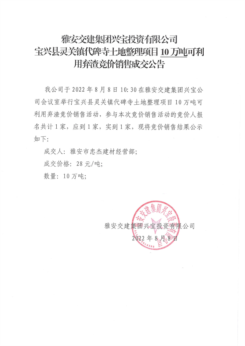代碑寺土地整理項(xiàng)目10萬(wàn)噸可利用棄渣競(jìng)價(jià)銷售成交公告