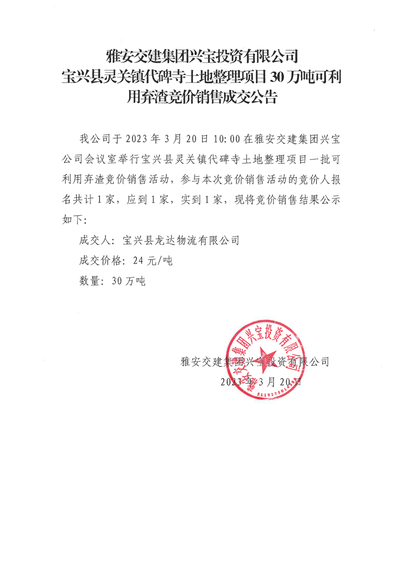 雅安交建集團(tuán)興寶投資有限公司靈關(guān)鎮(zhèn)代碑寺土地整理項(xiàng)目30萬噸可利用棄渣競(jìng)價(jià)銷售成交公告(2023.3.20)
