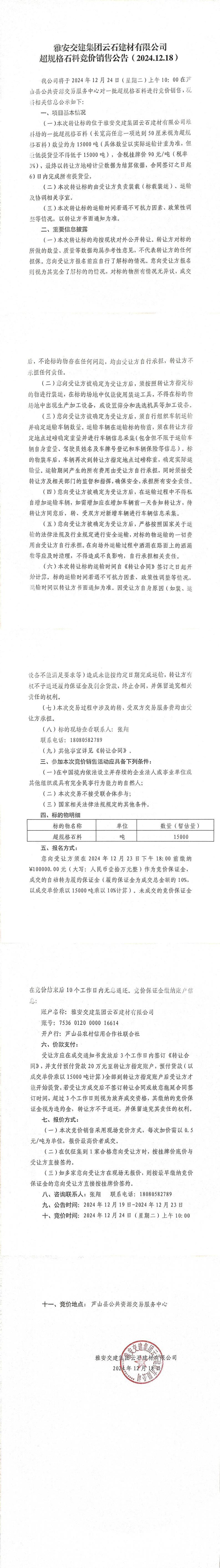 ÑŰ²½»½¨¼¯ˆF(tu¨¢n)ÔÆÊ¯½¨²ÄÓÐÏÞ¹«Ë¾³¬ÒŽ(gu¨©)¸ñʯƷÁϸ‚ƒräNÊÛ¹«¸æ£¨2024-12-19£©