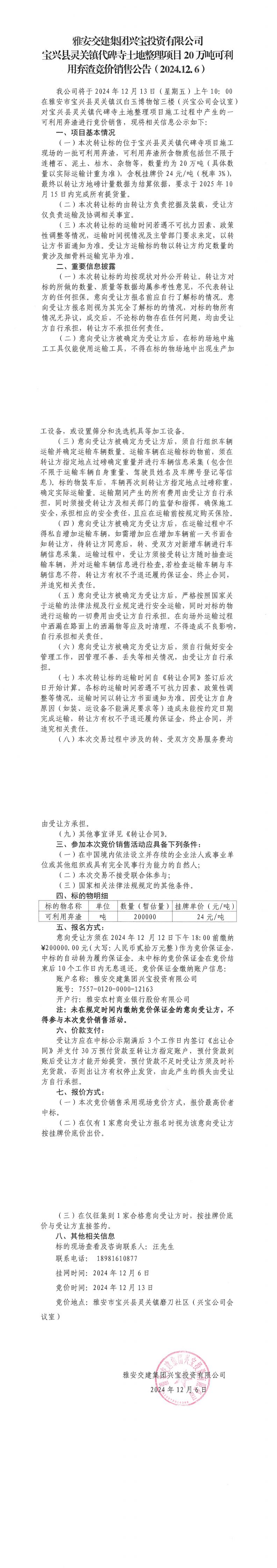 雅安交建集團(tuán)興寶投資有限公司靈關(guān)鎮(zhèn)代碑寺土地整理項(xiàng)目10萬(wàn)噸可利用棄渣競(jìng)價(jià)銷(xiāo)售公告(2024.12.06)